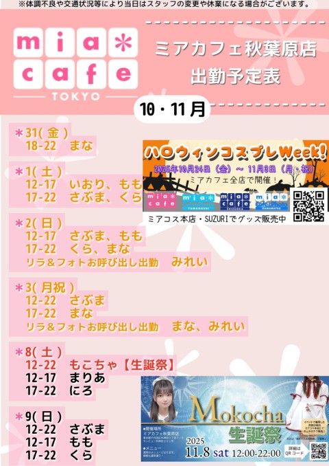 | å¶æ¥æé | âãã¢ã«ãã§æ±äº¬åºïŒã¡ã€ãã«ãã§ïŒhttp://www.mia-cafe.com/ãâ â¡å¹³æ¥ãæïœéãïŒïŒïŒïŒïŒïœïŒïŒïŒïŒïŒ â¡åæã»æ¥æã»ç¥æ¥ãïŒïŒïŒïŒïŒïœïŒïŒïŒïŒïŒ â å®äŒæ¥ããªãïŒ2019幎1æããå®äŒæ¥å»æ¢ïŒ â¡ã©ã¹ããªãŒããŒãéåºã®ïŒïŒåå ãïŒïŒïŒïŒïŒéåºã®å ŽåâïŒïŒïŒïŒïŒã©ã¹ããªãŒããŒ å¶æ¥æ¥ãåºå€ç¶æ³ã«ã€ããŠã¯ãã¡ãã http://pandaland.cutegirl.jp/mif/c_cms_csv/sch_top.php âãã¢ãªã©ïŒãã©ãæ±äº¬åºïŒæ®åœ±äŒïŒãªãã¬ïŒhttp://www.mif-lr.com/ãâ â¡å šæ¥ãïŒïŒïŒïŒïŒãïŒïŒïŒïŒïŒãã§ãããªã©ã¯ãŒãŒã·ã§ã³åºå€ã¹ã¿ãããããæé垯ã®ã¿å¶æ¥ã§ãã â å®äŒæ¥ã¯äžå®äŒïŒåºå€ã¹ã¿ãããããæé垯ã®å¶æ¥ïŒ â¡æçµåä»ãéåºã®ïŒïŒåå ãïŒïŒïŒïŒïŒéåºã®å ŽåâïŒïŒïŒïŒïŒïŒïŒïŒïŒïŒïŒè¿ã«æœè¡æéãçµããã³ãŒã¹ïŒ â»é«æ ¡çäžå¯ âæ·±å€å¶æ¥ã«ã€ããŠã¯ãå ¬åŒãµã€ãå³äžã® http://market.chu.jp/schedule1/sche37.cgi ãã¢ã°ã«ãŒãç·åã¹ã±ãžã¥ãŒã«ïŒïŒ°ïŒ£ã»ã¹ããïŒ http://market.chu.jp/schedule1/sche37.cgi?dm=1 ãã¢ã°ã«ãŒãç·åã¹ã±ãžã¥ãŒã«ïŒã¬ã©æºåž¯ïŒ ãã芧ãã ãããåç¥æ¥ã®ã¿å¶æ¥ãšãªããŸããåç¥æ¥ä»¥å€ã¯æ·±å€å¶æ¥ããããŠãããŸããã æ·±å€å¶æ¥å¯Ÿè±¡æ¥ãïŒïŒïŒïŒïŒãç¿æïŒïŒïŒïŒïŒïŒ¬ïŒïŒ¯ïŒïŒïŒïŒïŒïŒ | ||||||||||||||