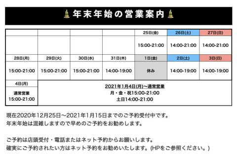 | 営業時間 | 現在営業時間を短縮しております。 平日15:00-21:00 土日14:00-22:00 火・水・木はお休みです。 | ||||||||||||||