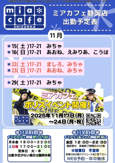 | 営業時間 | 静岡店は出勤スタッフがいれば営業です! 基本的に 12時~22時が営業時間です! ●静岡店のツイッター @shizuokamaidsan https://twitter.com/shizuokamaidsan ●ミア静岡店の営業曜日&営業時間● ☆月〜木 14:00〜22:00(最終受付20:00) ☆金曜日 12:00〜22:00(最終受付21:00) ☆土・日・祝 12:00〜22:00(最終受付21:00) 営業時間外はオンライン予約にてお願いいたします。 PC・携帯共通 → http://m-kanzume.moo.jp/yoyaku2/user.cgi ●ミアガイド出勤状況● スマホ・PC → 後日公開予定 ★静岡店スタッフによるミア甲府店でのメイドカフェリアル営業★ ☆不定期 サイトにてご確認ください。 http://market.chu.jp/schedule1/sche37.cgi | ||||||||||||||