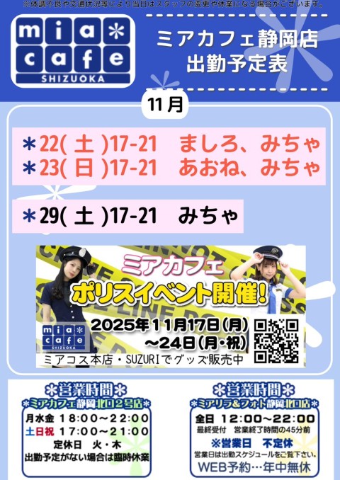 | å¶æ¥æé | é岡åºã¯åºå€ã¹ã¿ãããããã°å¶æ¥ã§ãïŒ åºæ¬çã«ã12æïœ22æãå¶æ¥æéã§ãïŒ âé岡åºã®ãã€ãã¿ãŒã@shizuokamaidsan https://twitter.com/shizuokamaidsan âãã¢é岡åºã®å¶æ¥ææ¥ïŒå¶æ¥æéâ âæãæšã14:00ã22:00(æçµåä»20:00) âéææ¥ã12:00ã22:00(æçµåä»21:00) âåã»æ¥ã»ç¥ã12:00ã22:00(æçµåä»21:00) å¶æ¥æéå€ã¯ãªã³ã©ã€ã³äºçŽã«ãŠãé¡ãããããŸãã ïŒ°ïŒ£ã»æºåž¯å ±éãâãhttp://m-kanzume.moo.jp/yoyaku2/user.cgi âãã¢ã¬ã€ãåºå€ç¶æ³â ã¹ããã»ïŒ°ïŒ£ãâãåŸæ¥å ¬éäºå® â é岡åºã¹ã¿ããã«ãããã¢ç²åºåºã§ã®ã¡ã€ãã«ãã§ãªã¢ã«å¶æ¥â âäžå®æ ããµã€ãã«ãŠã確èªãã ããã ãhttp://market.chu.jp/schedule1/sche37.cgi | ||||||||||||||