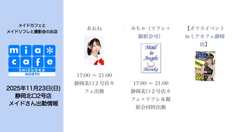 | 営業時間 | 静岡店は出勤スタッフがいれば営業です! 基本的に 12時~22時が営業時間です! ●静岡店のツイッター @shizuokamaidsan https://twitter.com/shizuokamaidsan ●ミア静岡店の営業曜日&営業時間● ☆月〜木 14:00〜22:00(最終受付20:00) ☆金曜日 12:00〜22:00(最終受付21:00) ☆土・日・祝 12:00〜22:00(最終受付21:00) 営業時間外はオンライン予約にてお願いいたします。 PC・携帯共通 → http://m-kanzume.moo.jp/yoyaku2/user.cgi ●ミアガイド出勤状況● スマホ・PC → 後日公開予定 ★静岡店スタッフによるミア甲府店でのメイドカフェリアル営業★ ☆不定期 サイトにてご確認ください。 http://market.chu.jp/schedule1/sche37.cgi | ||||||||||||||