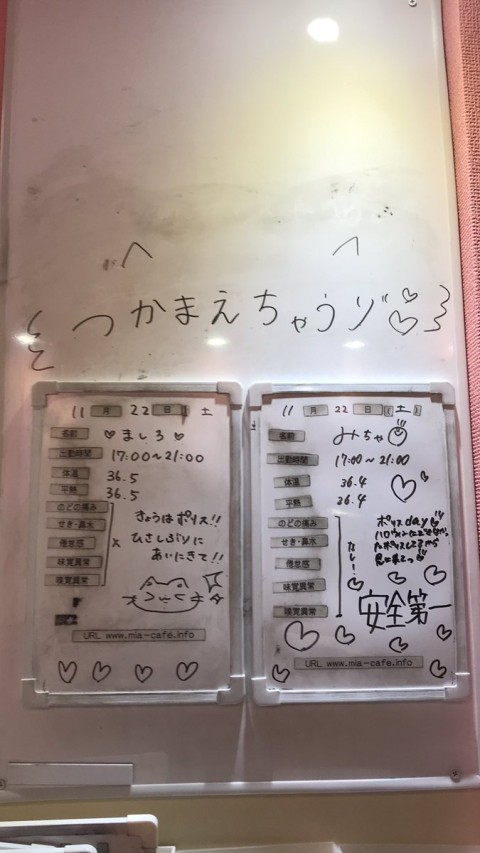| 営業時間 | 静岡店は出勤スタッフがいれば営業です! 基本的に 12時~22時が営業時間です! ●静岡店のツイッター @shizuokamaidsan https://twitter.com/shizuokamaidsan ●ミア静岡店の営業曜日&営業時間● ☆月〜木 14:00〜22:00(最終受付20:00) ☆金曜日 12:00〜22:00(最終受付21:00) ☆土・日・祝 12:00〜22:00(最終受付21:00) 営業時間外はオンライン予約にてお願いいたします。 PC・携帯共通 → http://m-kanzume.moo.jp/yoyaku2/user.cgi ●ミアガイド出勤状況● スマホ・PC → 後日公開予定 ★静岡店スタッフによるミア甲府店でのメイドカフェリアル営業★ ☆不定期 サイトにてご確認ください。 http://market.chu.jp/schedule1/sche37.cgi | ||||||||||||||
